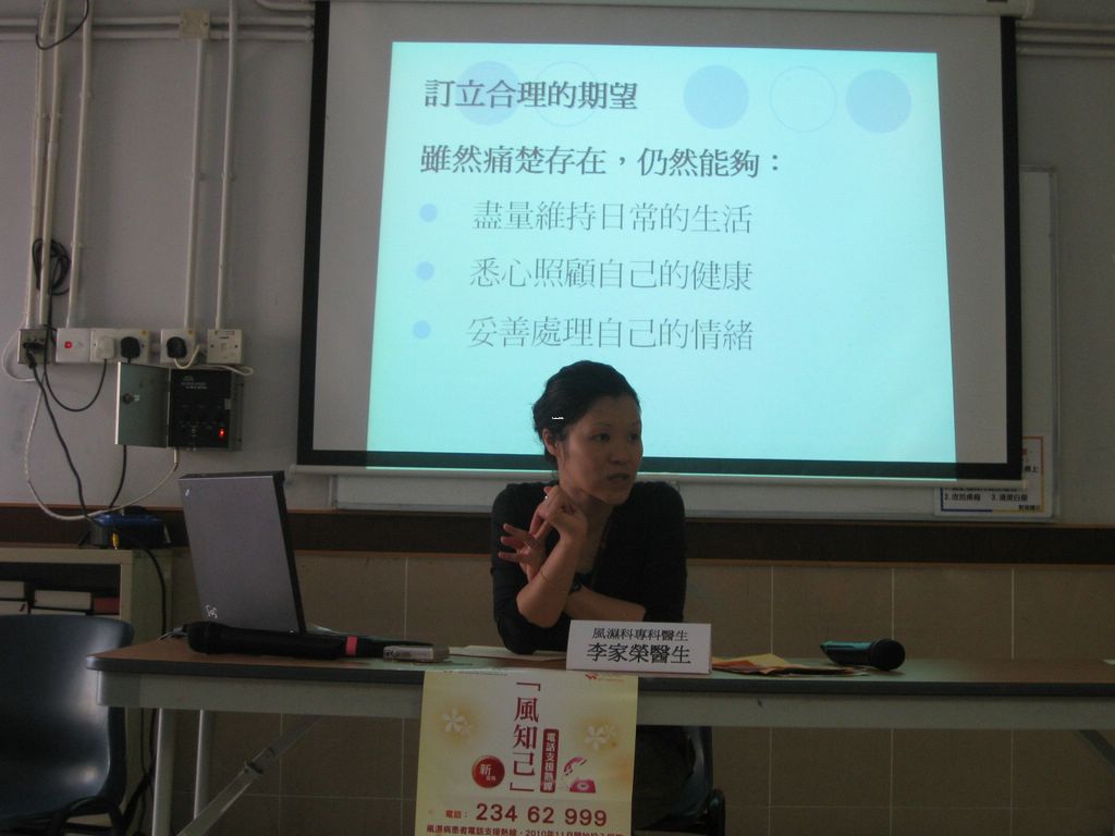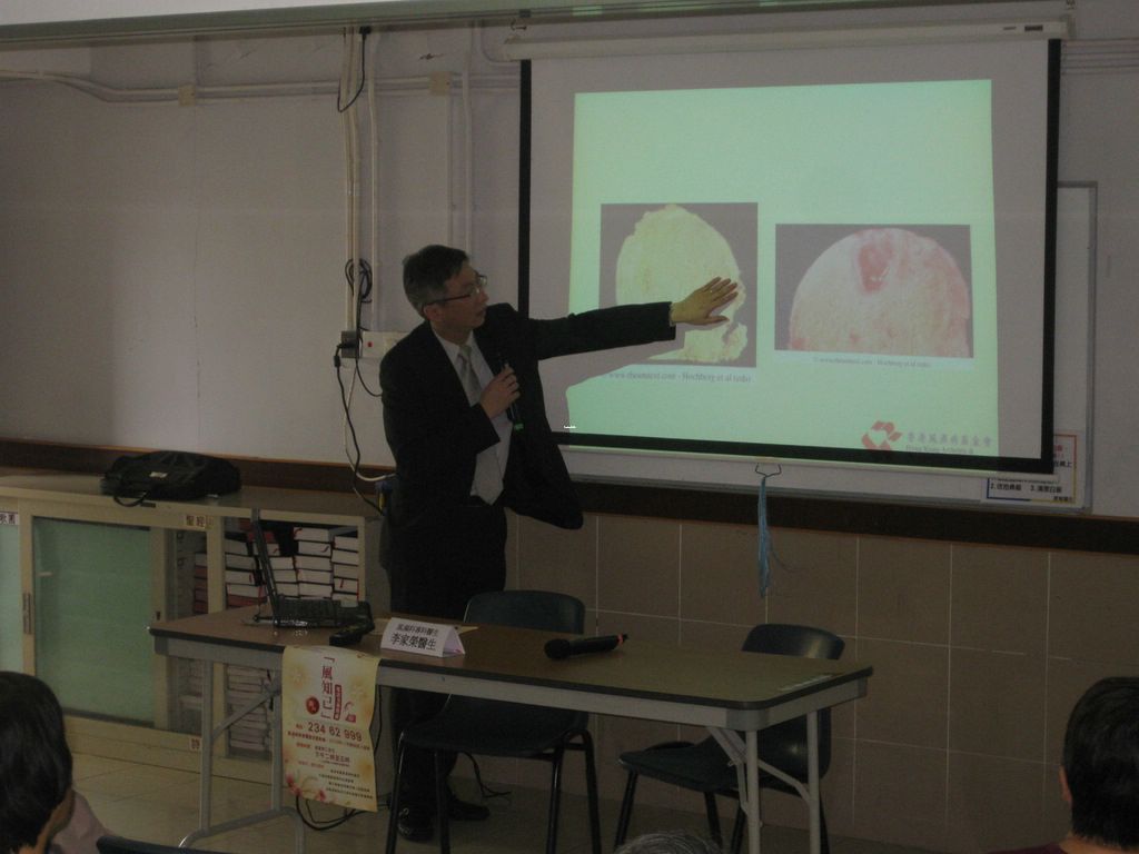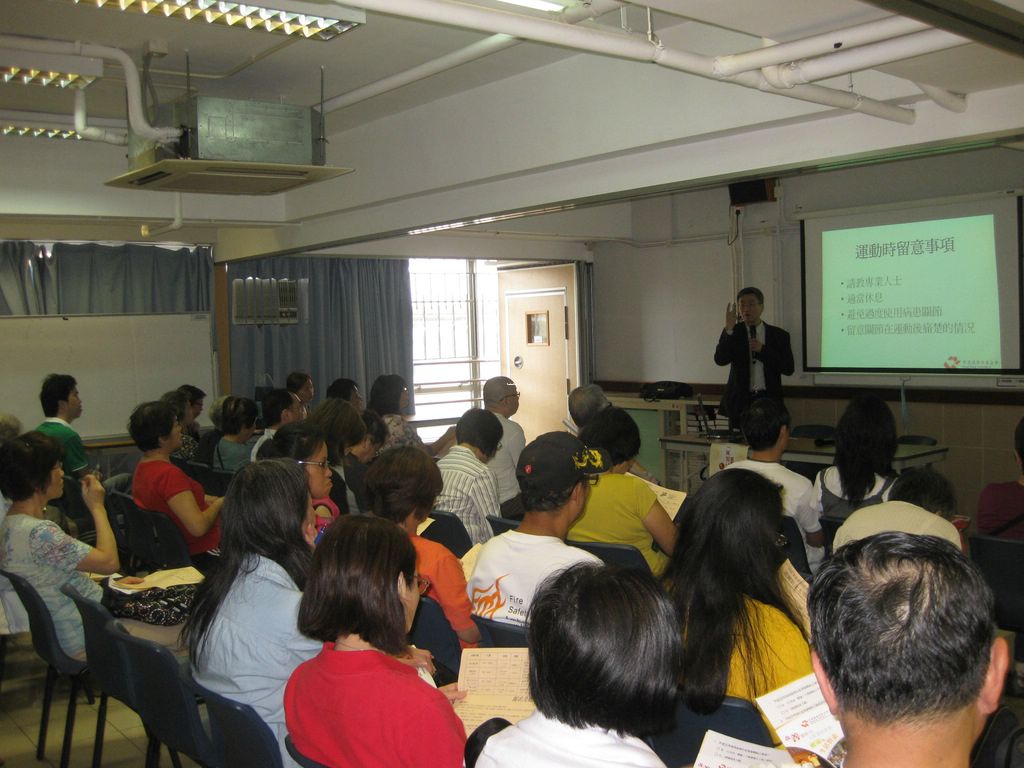是次講座請來風濕科專科醫生李家榮醫生主講,李醫生詳細解釋了骨關節炎的成因、病狀及治療方法。他還與在場約50名參加者一同做些伸展運動,鼓勵受骨關節炎影響的參加者在日常生活多做簡單的運動改善健康狀況,不可單靠藥物治療。及後,香港復康會社區復康網絡社工關姑娘亦向參加者講解如何在日常生活中從心理角度減輕「痛」的感覺。