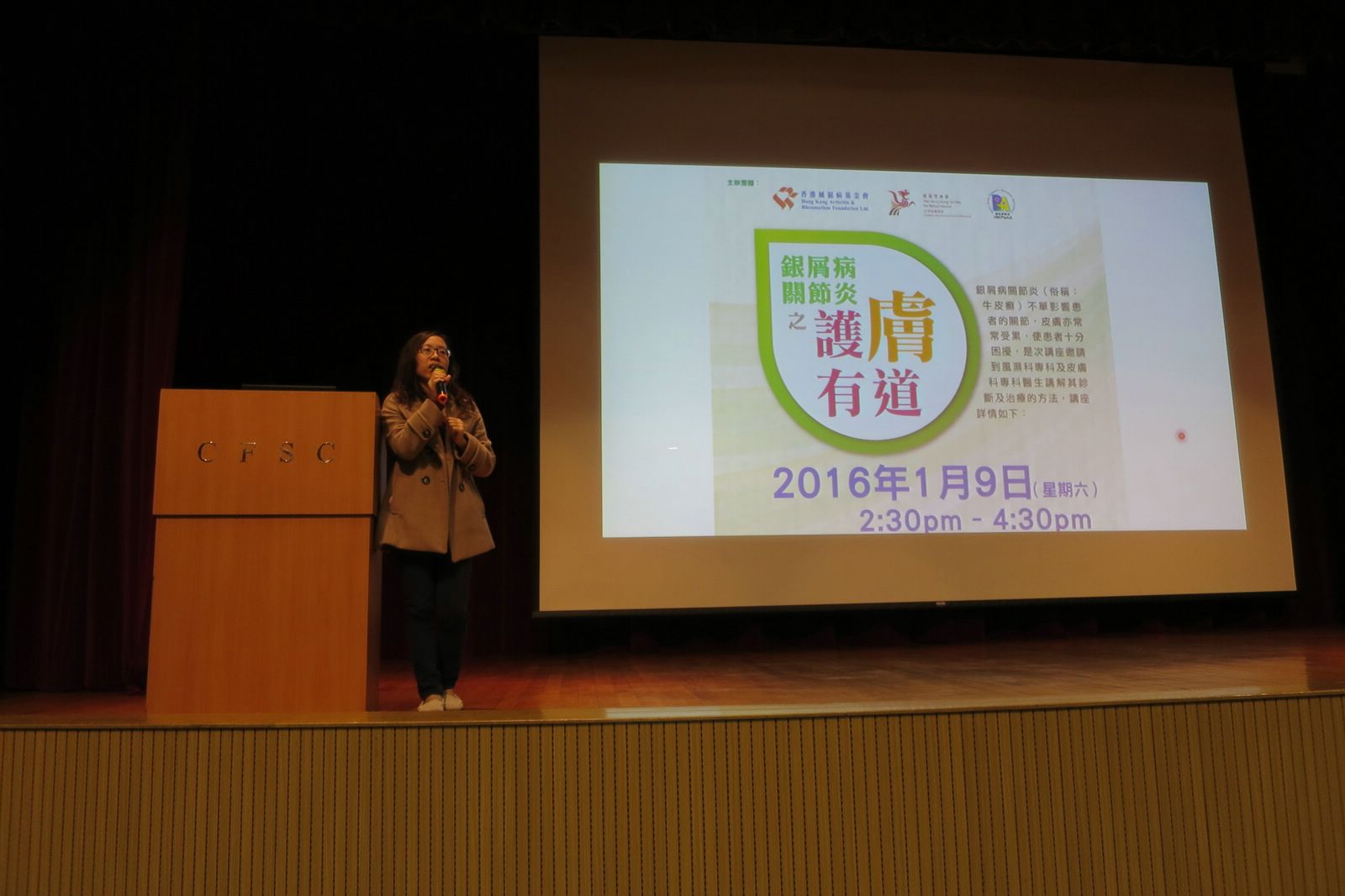 Educational Talk: PsA & Skin care was taken part in the Auditorium of Christian Family Service Centre in Kwun Tong on 9 January 2016. The talk aimed to enhance people’s understanding on the treatment and care of psoriatic arthritis (PsA). There were 41 participants in total.