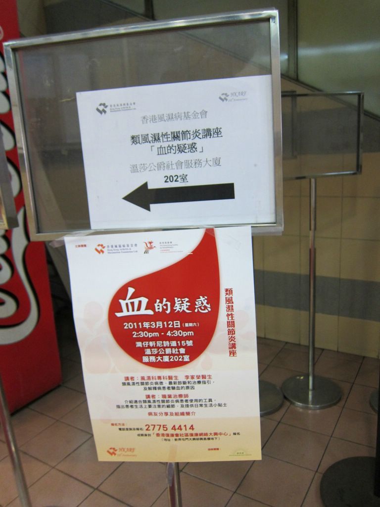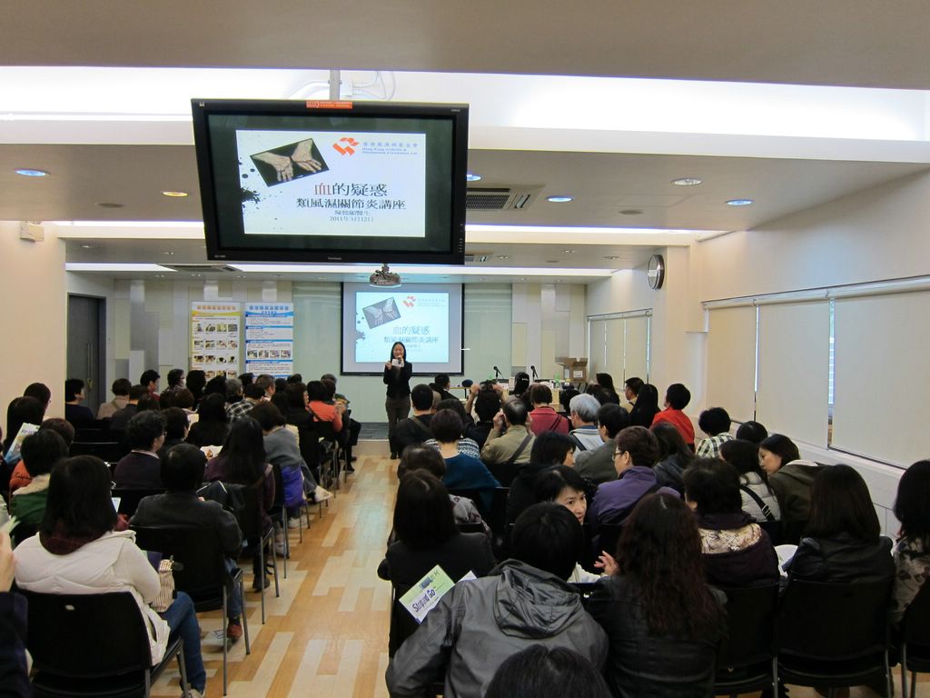 有見及此,香港風濕病基金會於2011年3月12日假溫莎公爵社會服務大廈舉辦名為「血的疑惑」的類風濕性關節炎講座,由風濕科專科醫生陳德顯醫生和職業治療師廖卓芬姑娘主講。陳醫生主要講解類風濕性關節炎病徵、最新診斷和治療指引及解釋病患者驗血的原因,而廖姑娘則向在場約130名參加者介紹適合類風濕性關節炎病患者使用的工具,指出患者生活上要注意的細節,及提供日常生活小貼示。兩位講者在問答環節亦積極解答參加者的疑慮,讓他們更了解自身的情況。