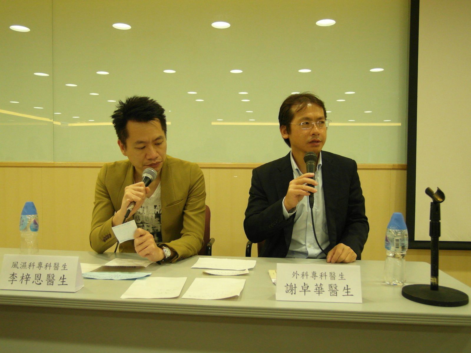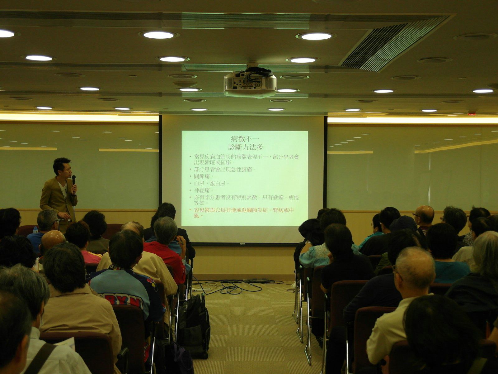 The talk was started by Dr. LEE Tsz Yan Samson, a specialist in Rheumatology, to explain the symptoms of Vasculitis. The illness could affect all kinds of vessel. Dr. LEE introduced Takayasu Arteritis, a commmon large vessel vasculitis, Polyarteritis nodosum, an example of medium vessel vasculitis and Wegener’s granulomatosus, Microscopic polyangiitis and Henoch-Schonlein Purpura, as examples of small vessel vasculitis. Since many patients did not show significant and obvious symptoms, they might be diagnosed incorrectly as rheumatoid arthritis, kidney disease or stroke. Dr. LEE urged participants to receive suitable treatment as soon as possible to prevent the growth of disease.
