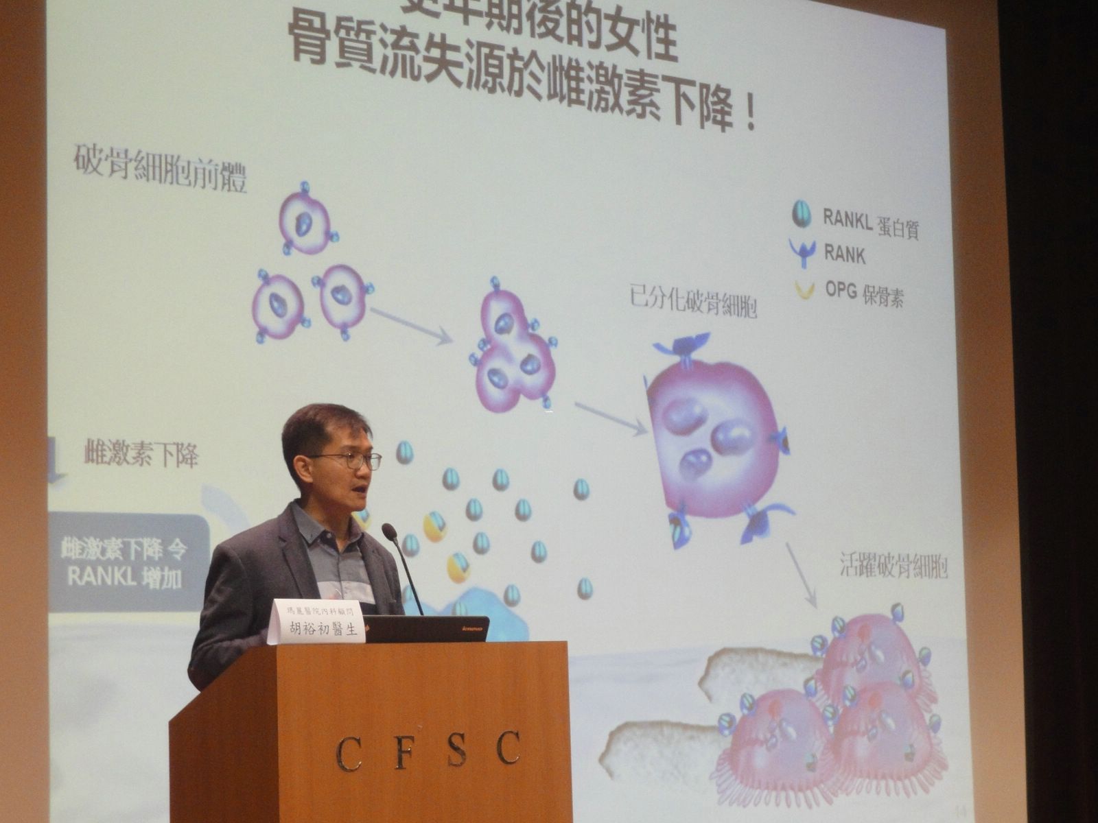Dr. Woo Yu Cho, a consultant of the medicine department of Queen Mary Hospital, first introduced the causes and treatment of osteoporosis to the audience. When the calcium level and bone density declines with age, bones weaken and over time can become brittle and prone to fracture. The most common fracture associated with osteoporosis occurs at thoracic vertebrae, wrist bones and pelvis joints. Patients who suffer from rheumatology should pay special attention when they are medicated with steroids as the bone density may decline. In addition, people with a family history of osteoporosis, who are risky to osteoporosis, are advised to receive x-ray imaging for diagnosing the disease. Dr. Woo added that the side effects of oral medication commonly used in osteoporosis have been significantly reduced when compared with the old drugs. Patients do not have to worry too much about the medication as the intake method is simple.