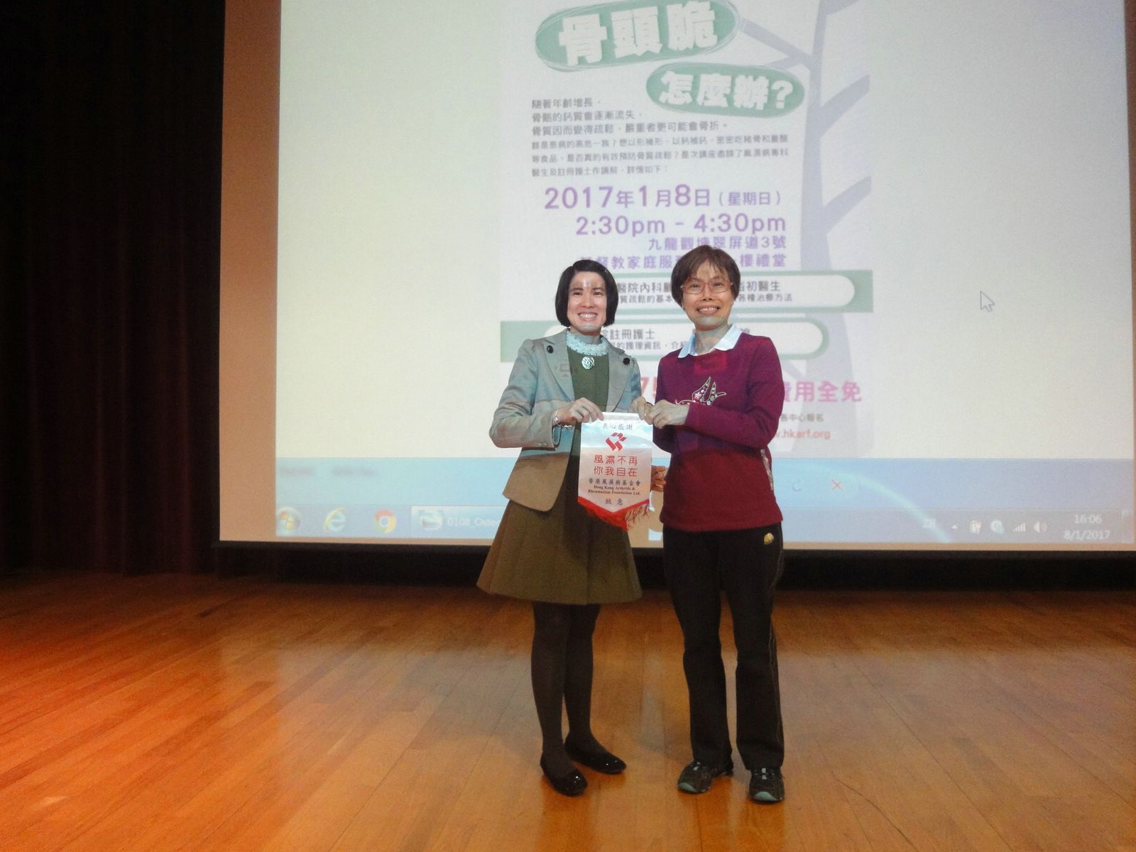 Hong Kong Arthritis & Rheumatism Foundation (HKARF) and Community Rehabilitation Network of the Hong Kong Society for Rehabilitation (CRN) jointly organized a talk “Tackling osteoporosis” on 8 January, at the Auditorium of Christian Family Service Centre. There were a total of 106 participants on that day.