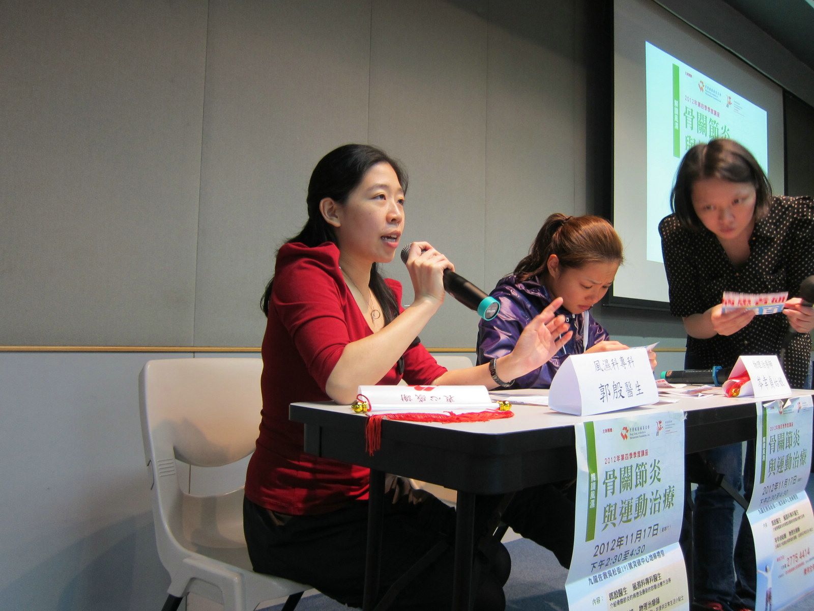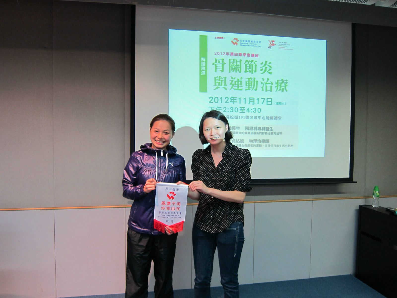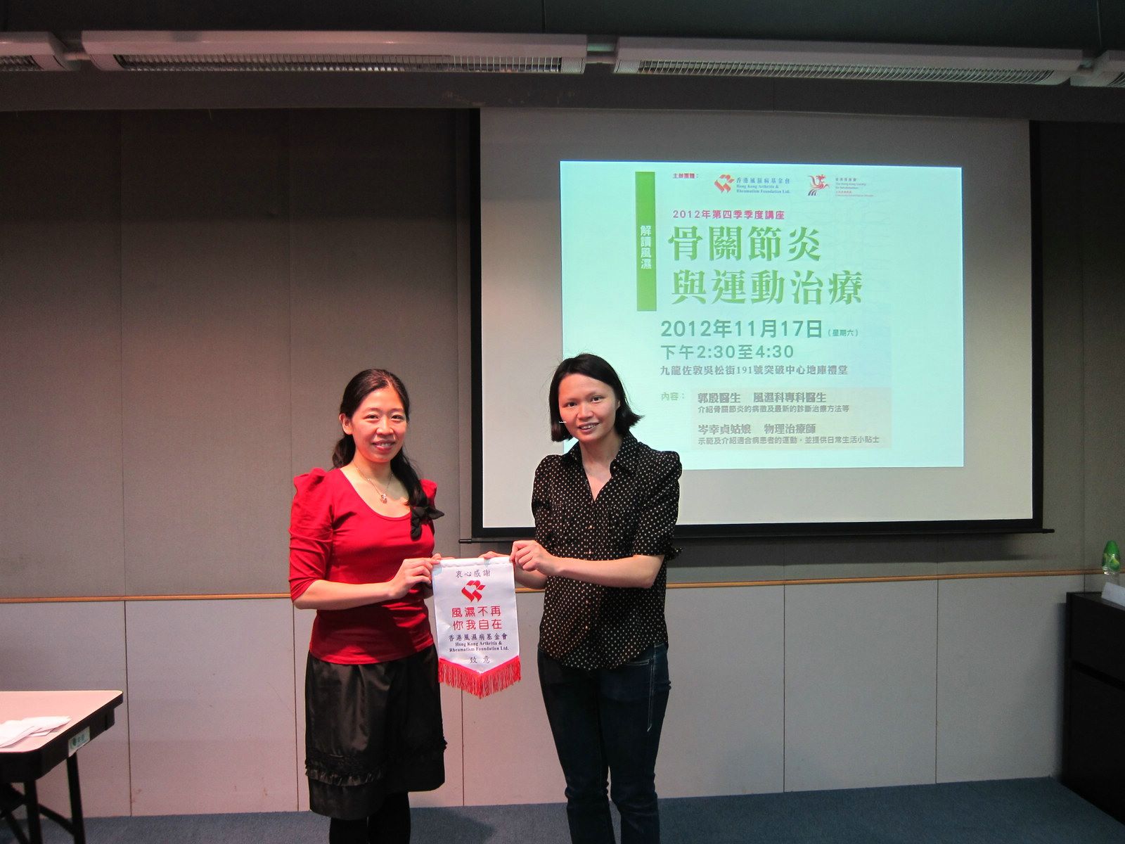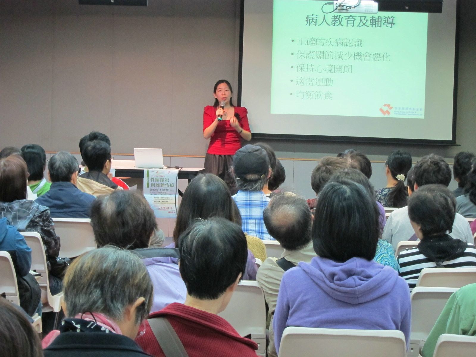 The talk started with a presentation conducted by Dr. Kitty Kwok, a Specialist in Rheumatology, who provided a clear explanation of the factors, symptoms and diagnosis of OA. She also explained various treatments including drugs, counseling, sports, stress control, physiotherapy and occupational therapy. She also defined the difference between RA and OA, which the public usually mixed up.
