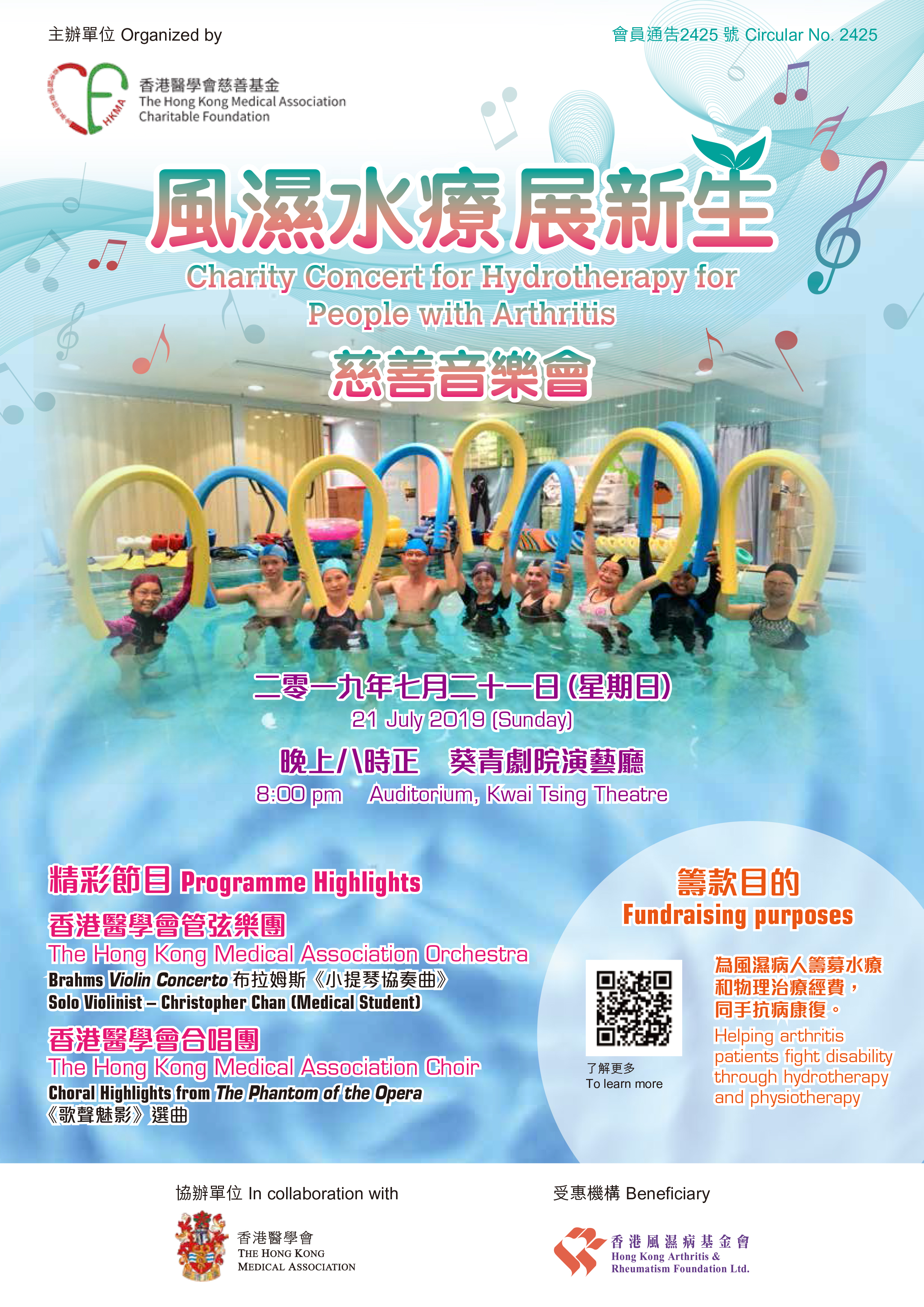 香港醫學會慈善基金於二零一九年七月廿一日(星期日)晚上假葵青劇院舉行年度慈善音樂會。是次活動所籌得的善款和相關收益,不扣除任何開支,將全數撥捐「香港風濕病基金會」,資助專為關節炎及風濕病人而設的水療運動班及物理治療運動班,提升其活動能力,令生活質素得以改善。