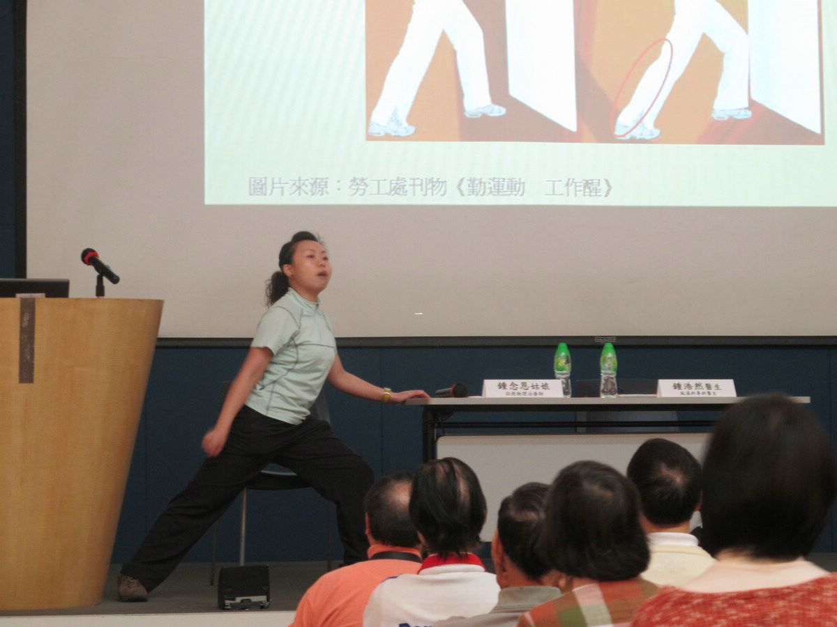 接著,物理治療師鍾念恩姑娘講解患者做運動時需注意的事項。除此之外,亦親身示範一些適合風濕病患者進行的動作,並邀請台下觀眾參與,現場反應熱烈。鍾姑娘又提供了一些止痛護理貼士,好讓聽眾於適當時可運用,減輕痛楚。