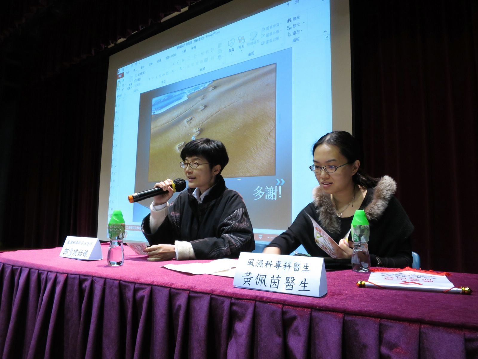 講座先由風濕專科資深護師郭雪琪姑娘以一個病例貫穿整個演講,說明如何診斷及風濕專科護士的工作。她先歡迎參加者到風濕專科護士門診,接著說明護士在收到轉介後會如何跟進和處理,並逐一介紹診斷的方法和確診類風濕性關節炎的標準。風濕專科護士在多方面支援患者,病科教育、病情監察、治療效用及風險評估、心理輔導等都是他們的工作,在患者的抗病歷程上出一分力。最後,郭姑娘重申醫院風濕及免疫科的諮詢電話服務的設立目的,希望參加者明白這個服務並非病友查詢覆診時間或其他科的轉介情況,而是讓有需要的患者就用藥的反應等問題作查詢。