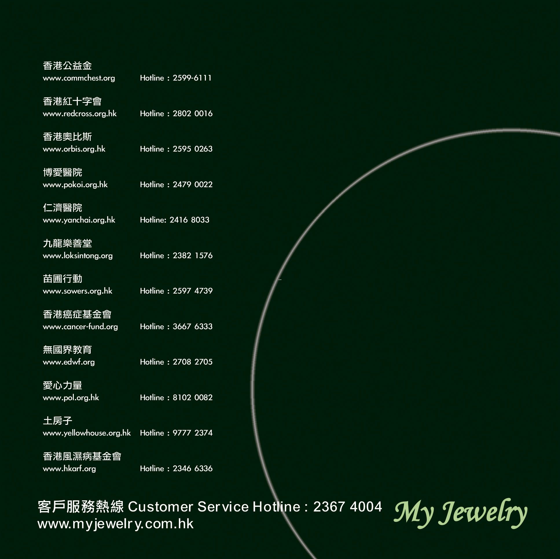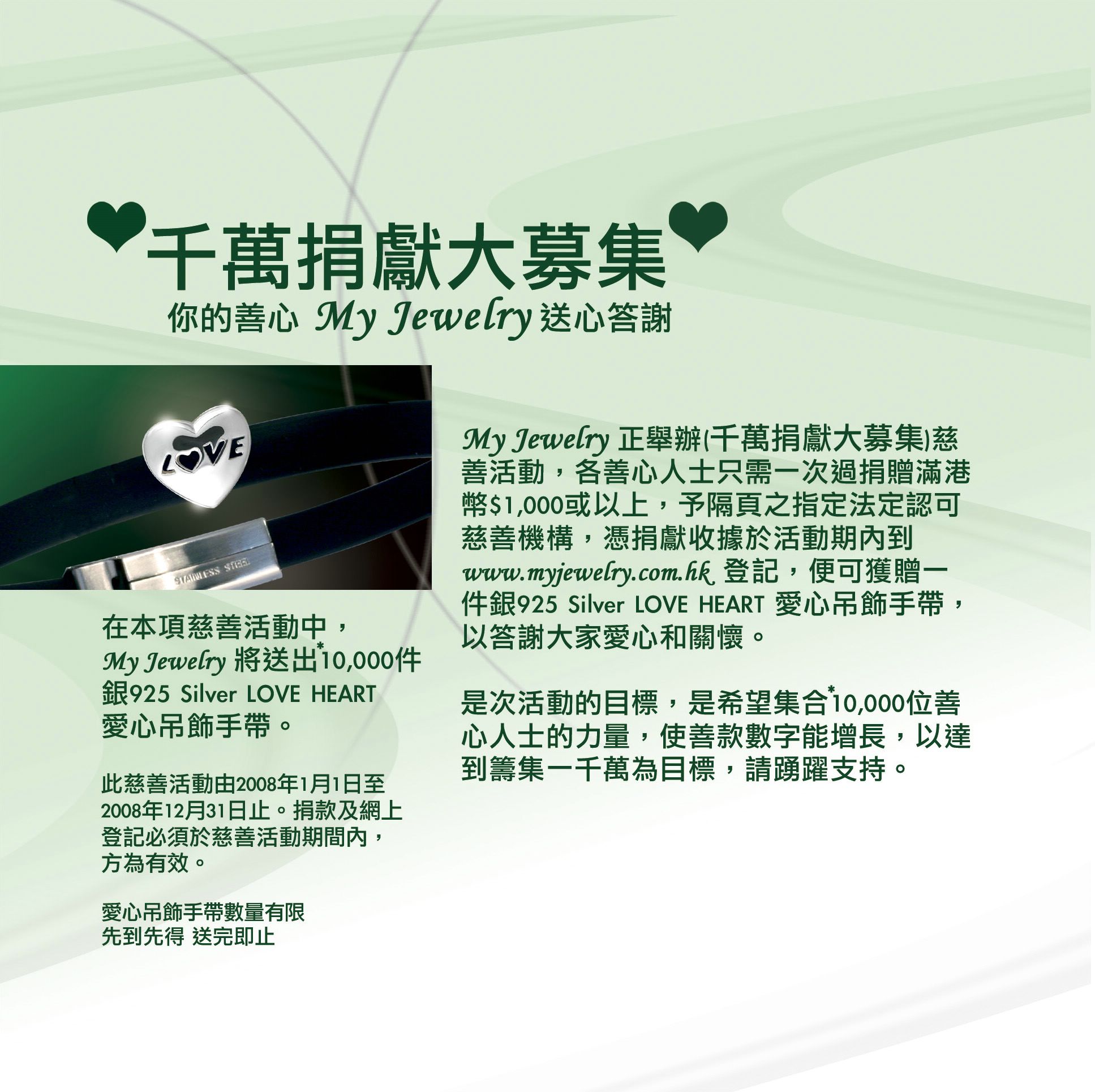 My Jewelry正舉辦「千萬捐獻大募集」慈善活動,各善心人士只需在2008年1月1日至12月31日期間,捐贈港幣滿1,000元或以上,予香港風濕病基金會或其他指定的慈善機構,憑捐獻收據到http://www.myjewelry.com.hk/登記,便可獲贈一枚銀925 Sliver LOVE HEART愛心吊飾手帶,以答謝大家的愛心和關懷。