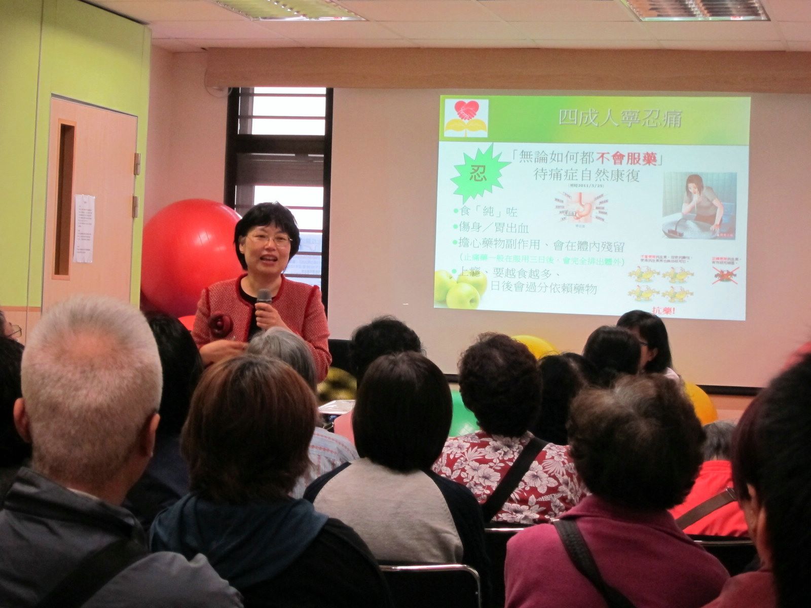及後,註冊藥劑師容蕙蘭博士先簡介一般骨關節炎的治療方法,亦指出一般人對藥物治療的誤解。她解釋使用止痛藥的目的及成效,以減輕大眾對用藥的抗拒。另外,透過介紹世界衛生組織對止痛藥的分類方法──「三階梯止痛法」,容博士帶出使用藥物的正確方法及其副作用,使參加者了解藥物管理的重要性。