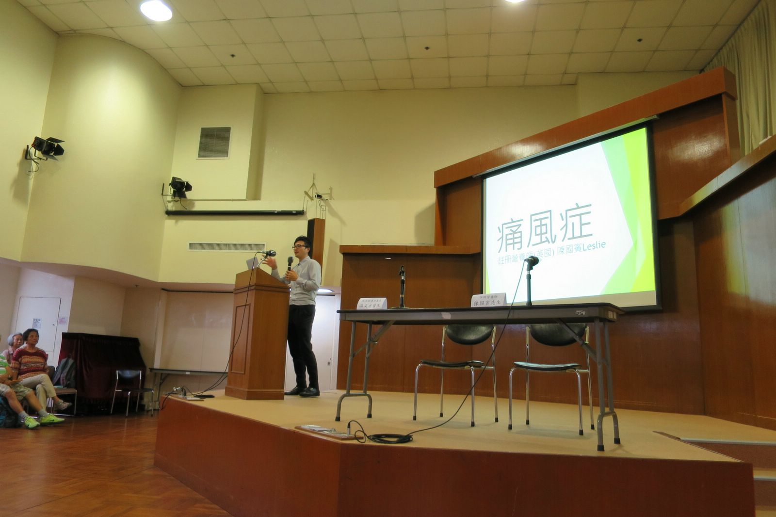 講座由風濕科專科溫文才醫生開始,向參與者詳細講解痛風症的成因﹑病徵及治療方法。雖然痛風症成因未明,但溫醫生指出,人體尿酸水平長期過高會增加患上痛風的機會。日常生活中常見的食物及藥物均帶有尿酸,市民宜注意攝取尿酸的份量。痛風症多於身體較少血液流動的部份出現,典型症狀包括腳拇趾發炎,容易引發急性痛風;另外亦有少數患者有大關節或指節疼痛等情況。同時,痛風症亦會引發其他併發症,如體內腎石的數目會增加,或出現痛風石等情況。