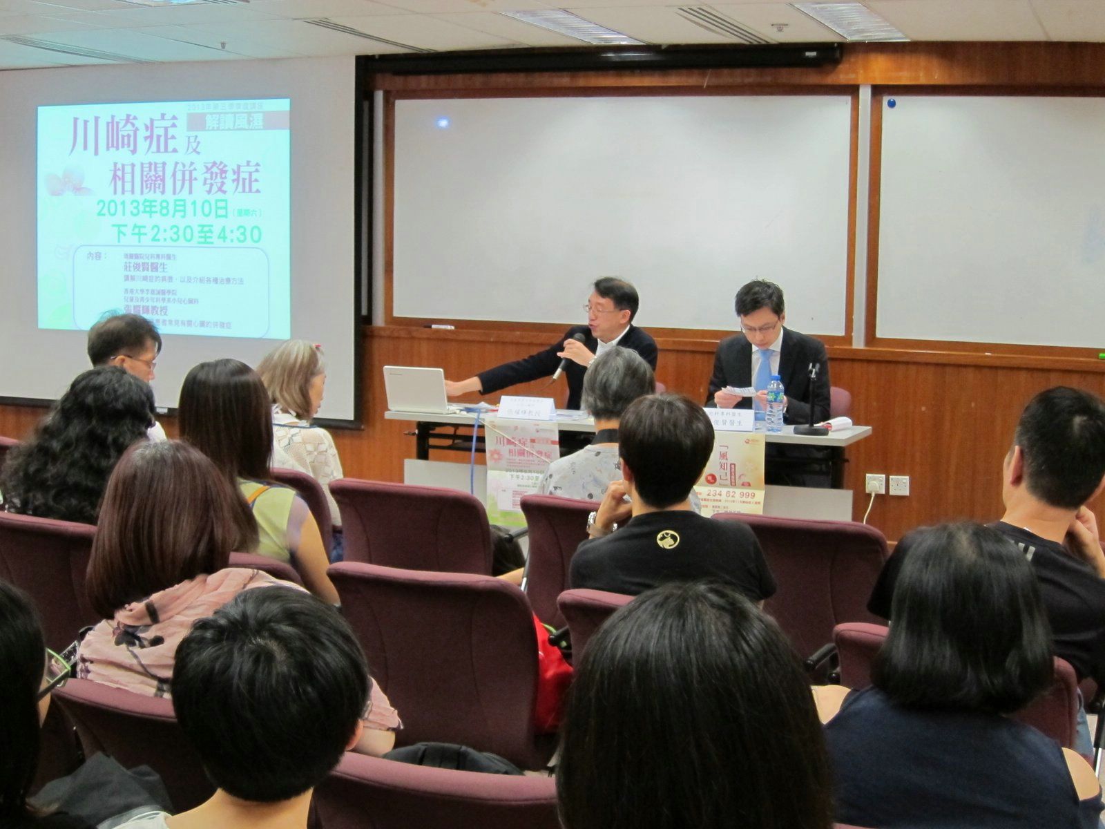 講座先由瑪麗醫院兒科醫生莊俊賢醫生向參加者講解川崎症的歷史,並利用大量的圖片幫助參加者了解各種病徵,如結膜炎、口腔黏膜紅腫潰爛、手腳紅腫及指尖脫皮等,希望提高對病症的警覺,及早接受治療以減低對冠狀動脈及心臟的影響。另外,莊醫生就川崎症的檢查及治療的方法作詳盡的說明,指出驗血能確認病情,並介紹各種治療方法,在發病的10天內以靜脈注射丙種球蛋白治療最為有效,可大大減低冠狀動脈瘤的風險。