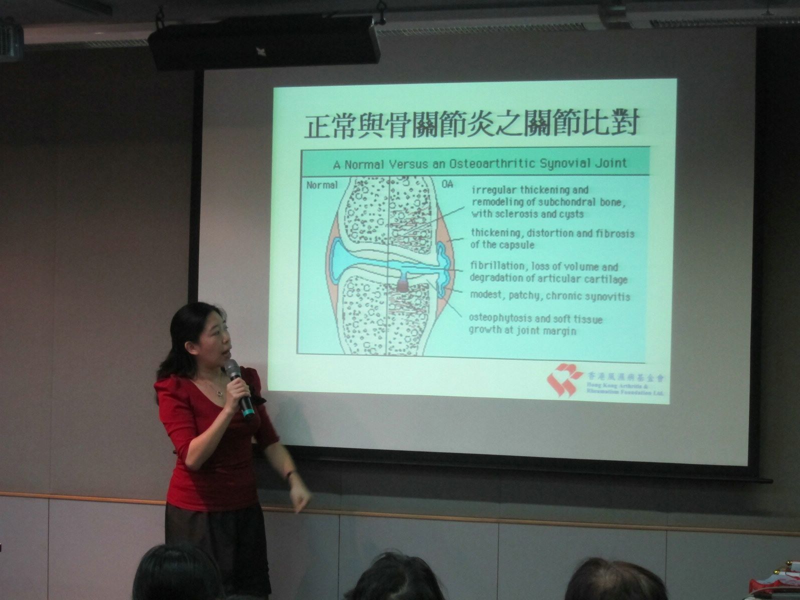 講座先由風濕病科專科醫生郭殷醫生為大家講解骨關節炎的成因、病徵和診斷。由於一般大眾容易誤以為關骨節炎等同類風濕性關節炎,郭醫生簡單介紹了兩者的分別,又解釋除了藥物治療外,運動、壓力管理、物理治療及職業治療等,均可以紓緩病情。
