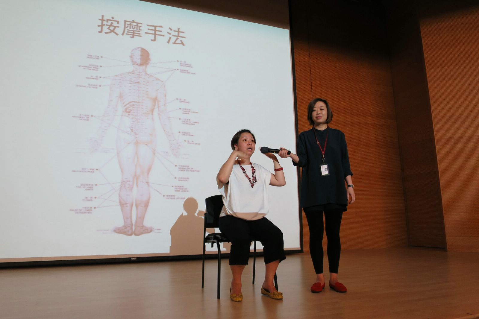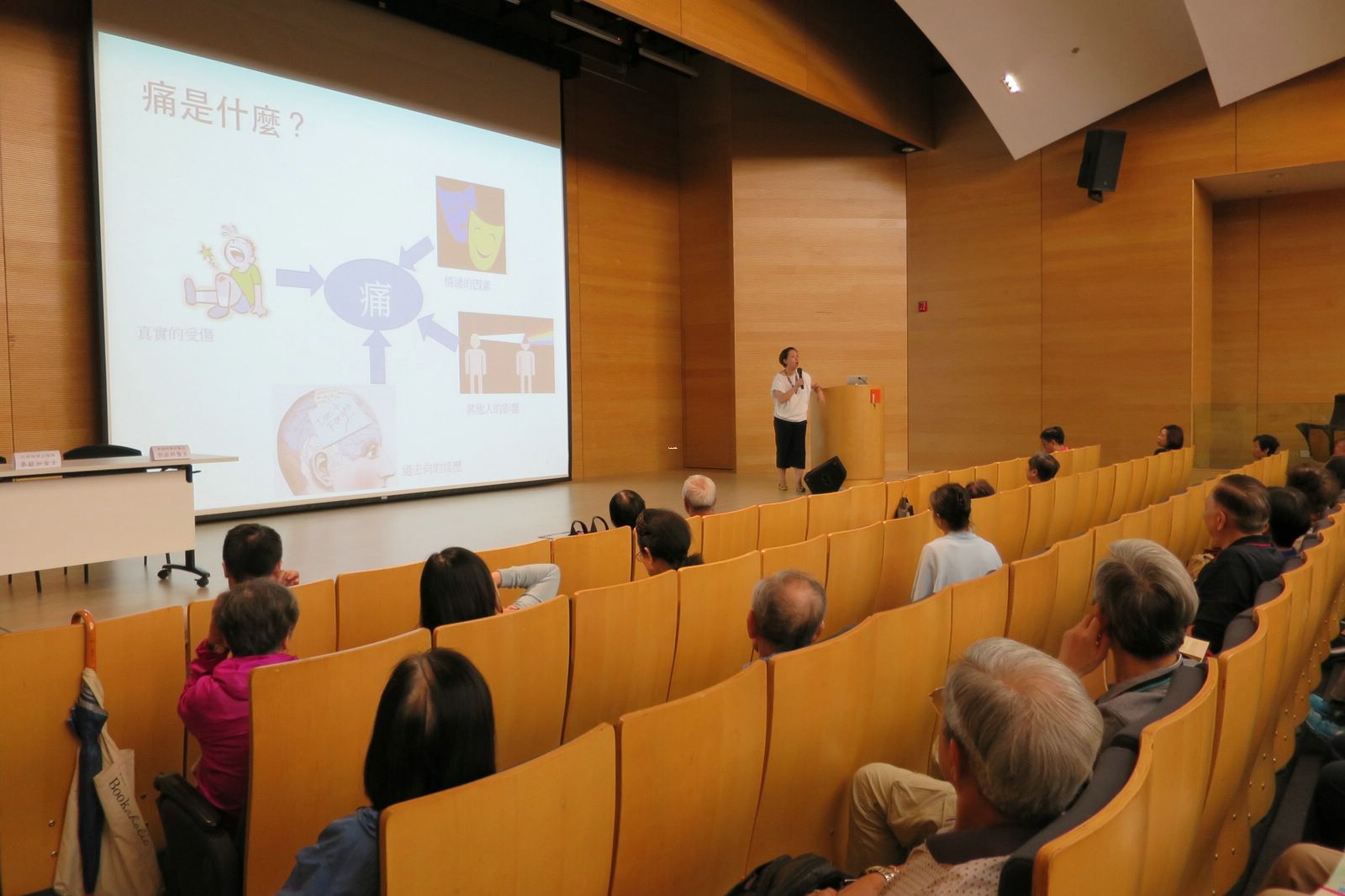 及後,註冊物理治療師麥敏如女士分享紓緩痛症的心得,她先問參加者「痛」是什麼,解釋「痛」是由情緒、過往的經歷、身體的感覺及其他人的影響結合而成,要對症下藥才能治療。因此,不應單靠服藥打針緩解身體的不適感覺,保持正面的思想及小心分析別人的言語行為都能幫助自己減輕疼痛,這是大部分人都忽略的因素。此外,很多人對冰敷有些誤解,麥女士特別解釋冰敷的正確做法,指出需要有痛和麻痺的感覺才有效,否則無法令血管重覆收缩和放鬆,促進血液循環以減輕痛楚和發炎的狀態。最後麥女士示範了一些簡單的按摩技巧及伸展運動,更分享自己看顧患者的經驗,鼓勵參加者時常保持正面的態度對抗疾病。