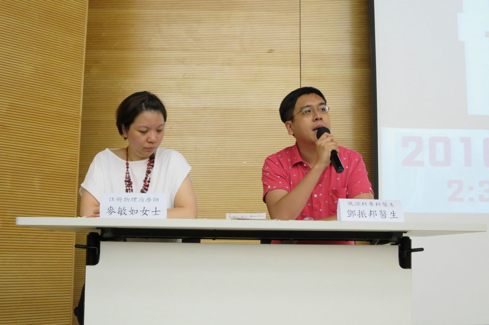 講座由風濕科專科鄧振邦醫生開始,簡單說明骨關節炎的成因及症狀,因關節老化令關節液分泌減少,加上軟骨長時間的勞動而磨損,引發慢性發炎或骨刺增生。早期治療的成效更為顯著,鄧醫生呼籲患者應盡早求醫,減少關節進一步磨損及加強修復。接著鄧醫生分析各種治療方法,指很多患者都不想服藥或打針,對於治療方法存有不少疑問,鄧醫生解釋使用哪一種治療取決於患者的期待,若希望盡快緩解痛症,可服用消炎止痛的藥物,但要留意服藥並不能阻止關節的磨損,長期服用亦有可能增加肝腎的負擔。若疼痛只能靠藥物緩解,患者可考慮其他的治療途徑,包括注射治療或人工關節置換手術等。