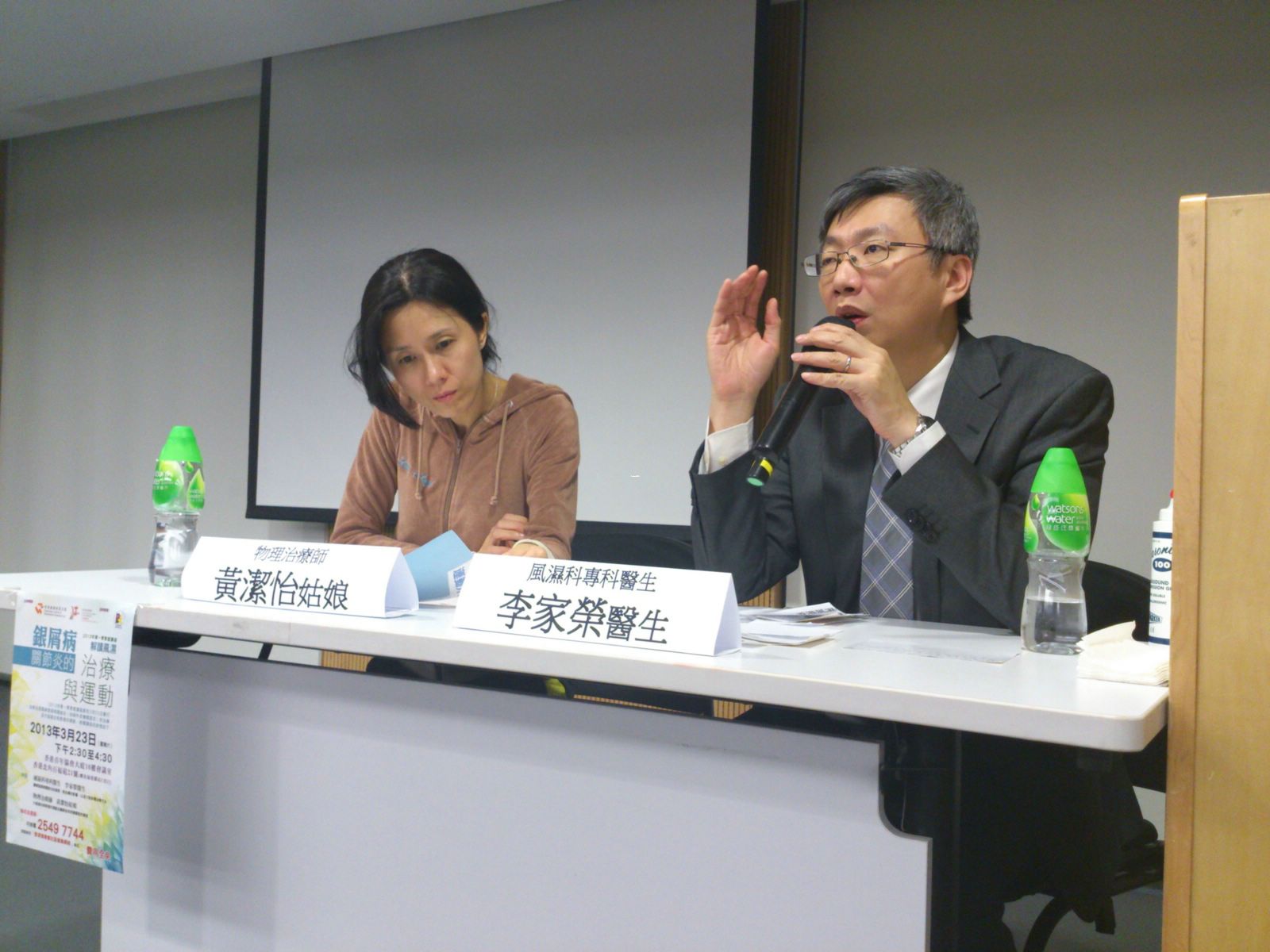 講座開始時,風濕科專科醫生李家榮醫生先簡單讓參加者認識銀屑病關節炎的症狀及診斷方法,並指出公眾教育及社區支援對治療此病的重要性。另外,李醫生透過講解各方面的資訊,消除大眾認為「銀屑病關節炎是無法醫治」的誤解,同時帶出藥物治療對控制病情尤為重要,患者應該提高警覺,及早積極治療。