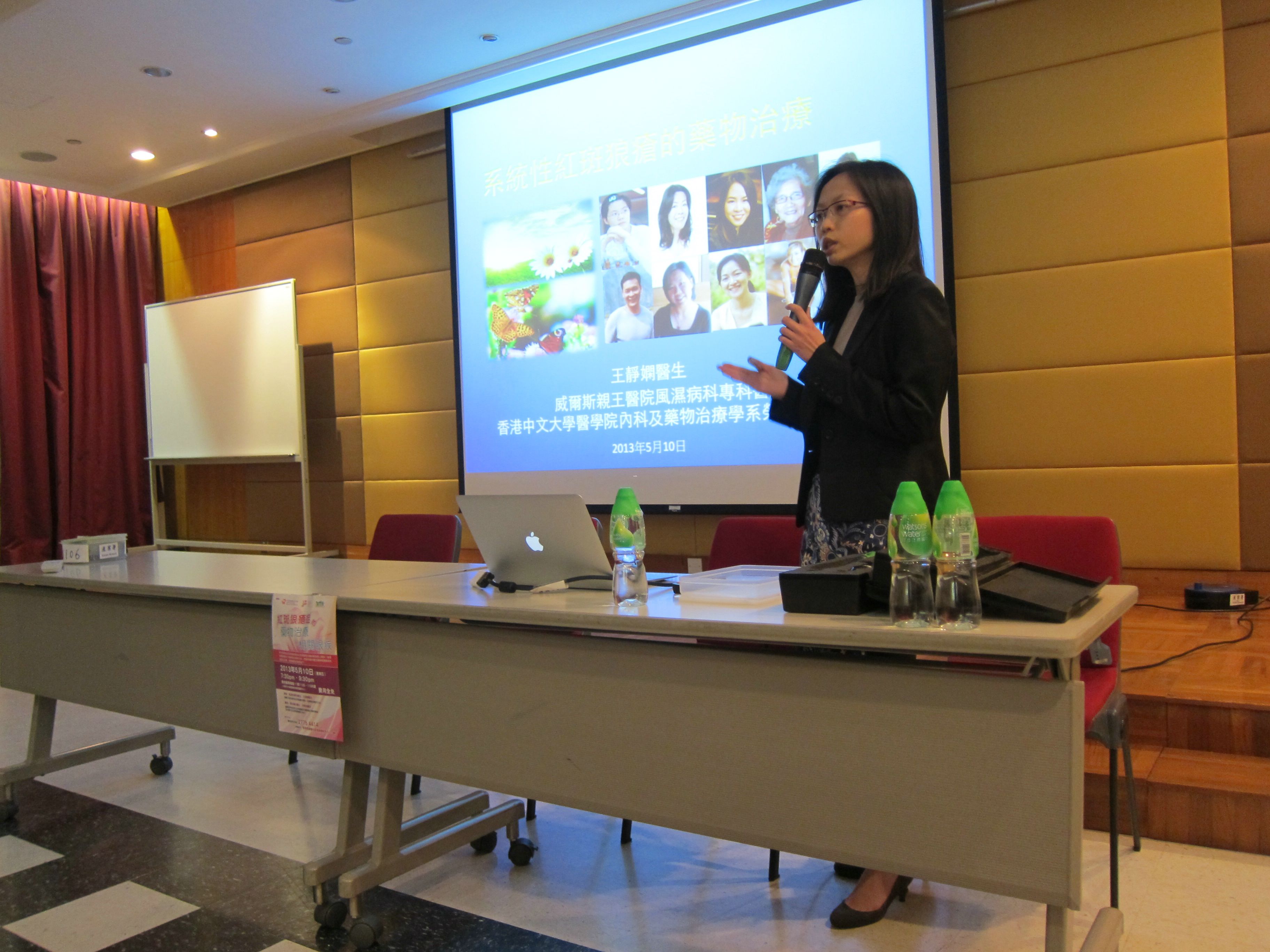 另外,風濕科專科醫生王靜嫻醫生先講解紅斑狼瘡症的病症,又展示各種皮膚上斑疹形態的相片,讓患者認識如何分辨此病症的嚴重程度。及後,再深入介紹各種藥物的種類及療效,指出藥物的劑量與病況的關係。最後,透過展示不同病人在診斷症狀前後的相片,王醫生指出有效的檢驗和治療對病情的控制尤為重要,亦藉此鼓勵病友及家屬積極面對,可以活出燦爛人生。