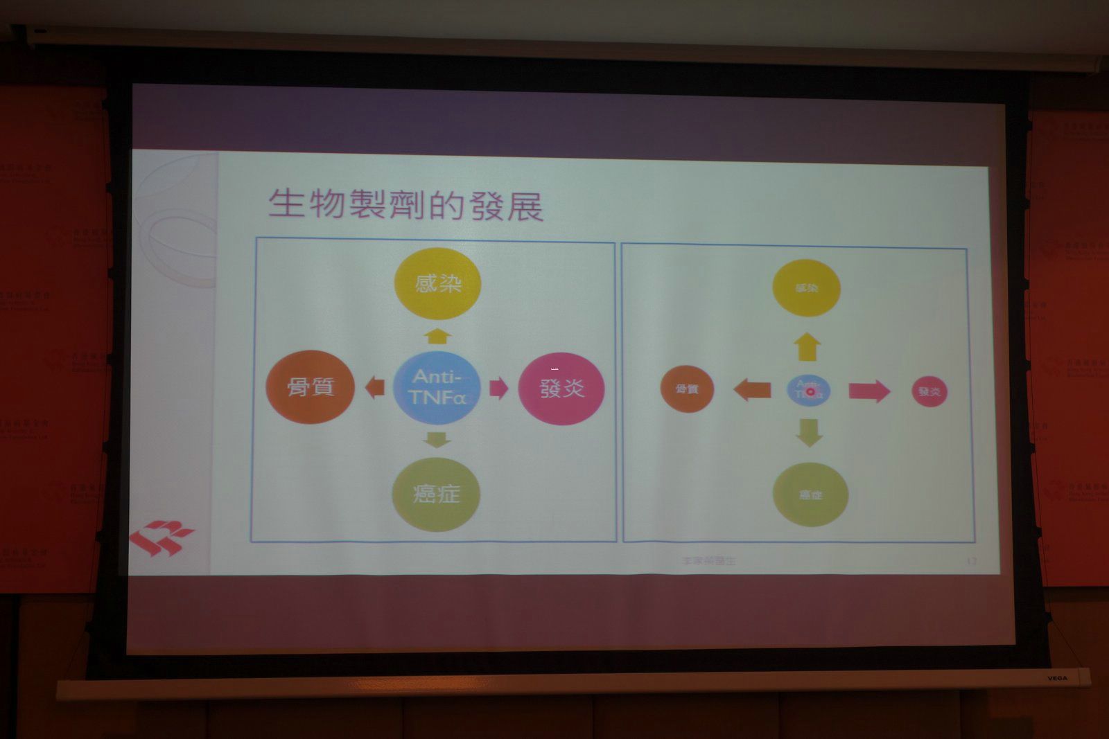 講座由風濕科專科李家榮醫生介紹生物製劑的歷史及發展,借一些外國及本港的研究結果說明其功效及副作用,並就常見的謬誤,如抗藥性問題、增加致癌的風險等作詳細的解釋。很多病人擔心生物製劑是人工產物,並不天然,因此誤以為副作用比一般口服藥物大,李醫生強調生物製劑是科研的成果,因醫學進步讓研究人員更了解人體的結構而研發的藥物,所以副作用相對較小而功效相對顯著。李醫生的說明讓參加者更清楚了解生物製劑的使用原則和時機,呼籲參加者不應誤信網上或報章的內容,若有疑問應向醫護人員查詢,如有需要使用生物製劑則應盡早使用,避免延誤治療時機。